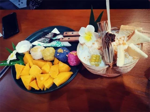 沒想到吧,糯米飯竟然還能和芒果組成新cp。這道具有泰式風格的美食,既可以是一道主食也可以是一道特色甜點,粉色、藍紫色、白色、黃色的糯米飯團被大塊的芒果團團包圍,光是看著就非常有食欲,先來一勺米飯配上芒果,吃出芒果糯米飯的原汁原味,之后再澆上備好的椰漿,即使是在冬天,你也能吃出一種夏日在芭提雅的度假之感。