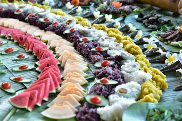 大筲箕上鋪上一層芭蕉葉,將傣族美食集合葷素搭配,加上食材染出的彩色糯米飯和水果,擺出各種精美的造型,用手抓著品嘗,整頓飯都吃得十分獨特。古樸美味的味蕾盛宴擺脫了傳統餐食的繁文縟節,用原始樸實的方式呈現在人們面前,頃刻間便能感受到突破桎梏的愉悅,與美味食材親密接觸,回歸質樸醇厚的飲食文化之中。