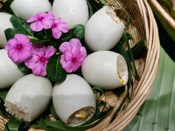 將糯米塞進雞蛋里,將簡單的食材吃出一種精致和儀式感。底部的蛋黃托住上層的糯米和蔬菜,如果整個剝開看,就像長在雞蛋上的一株白蓮花,一口下去,咸咸糯糯,蔬菜丁的甜加糯米飯的香再配上雞蛋的咸香,有層次地在口腔中擴散,一口接一口,當你回過神來,手里卻只剩下一個蛋殼了。