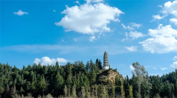 白塔位于大姚縣城西500米的寶筏山文筆峰頂,據道光《云南通志》記載:“白塔建于唐時,西域番僧所造。”整座塔高18.4米,由須彌座塔基、八角形塔身和紡錘體塔頂三部分組成,頂部呈圓椎形,塔身敷粉,在藍天白云下,晶瑩如雪。