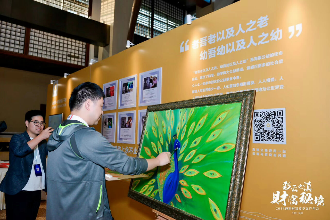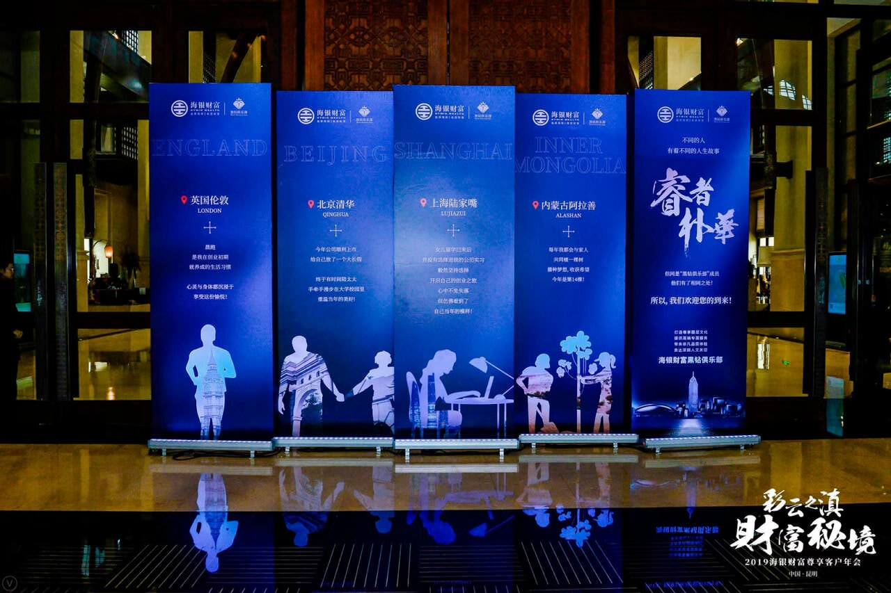 2019年海銀財富尊享客戶年會及答謝晚宴在滇池湖畔春城昆明召開;天行提供會議會展、獎勵旅游、市場活動管理及包括AV搭建、物料制作、活動場地、演藝、拓展、勞務人員等專項資源管理在內的專業會展服務。