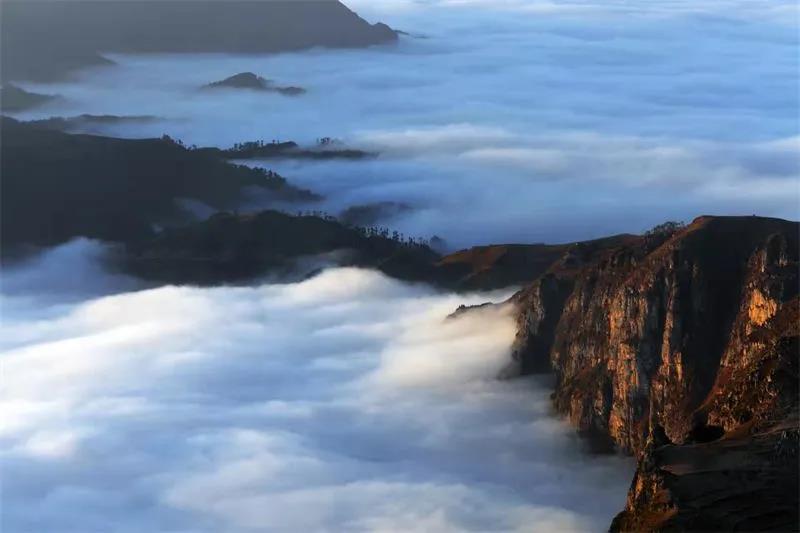哀牢山“云海日出”景觀,堪稱“滇中云海一絕”。晨光熹微,云海翻騰,潔白的流云把一座座山巒遮掩得若隱若現,云霧輕輕地碰撞、交融、推搡,緩慢翻騰、起伏,悄無聲息向腳下翻滾而來,似有騰云駕霧的暢快之感。
