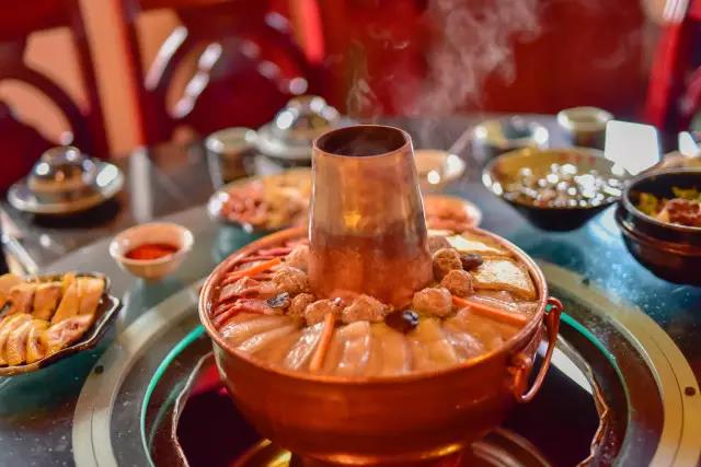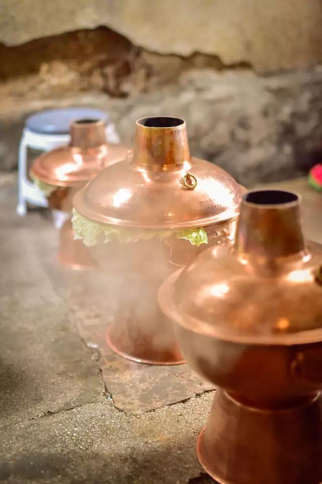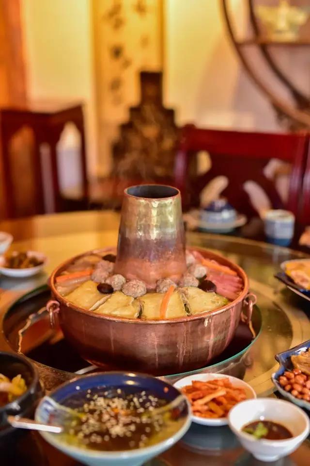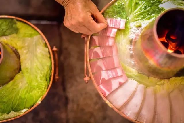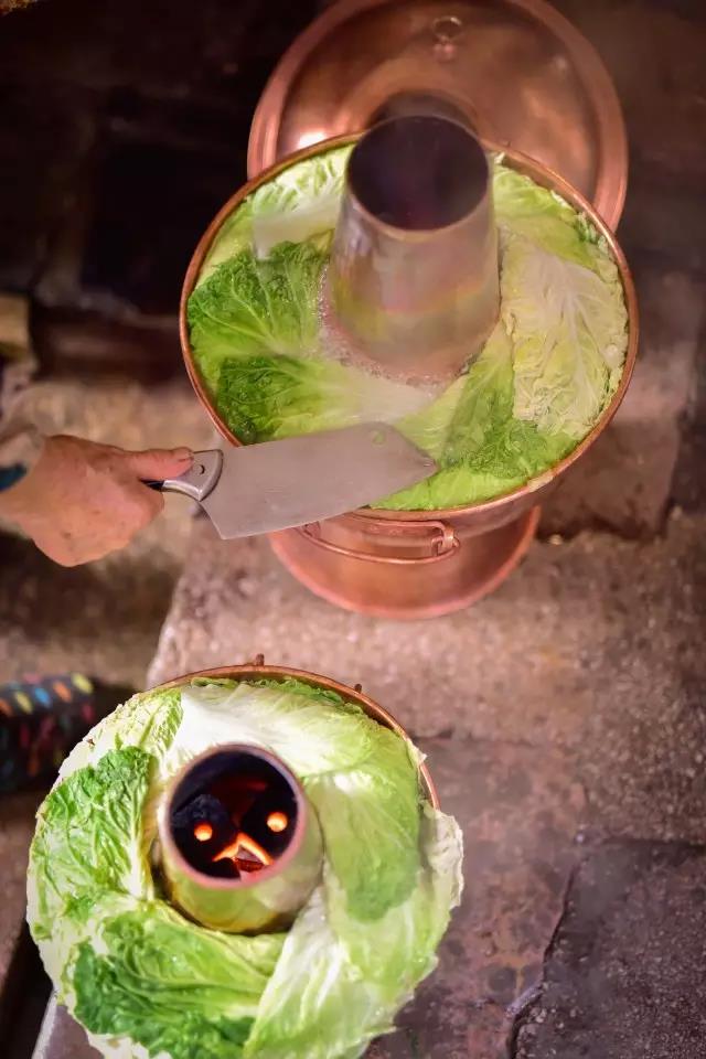 先將熬制好的高湯盛入銅鍋,放入些許鹽、胡椒等調料,舀入幾勺豬油,蓋上鍋蓋,在煙囪中加入無煙碳生火,等待高湯煮沸。高湯由店主憑借自己幾十年的經驗,獨家熬制。“放入土雞、排骨、筒子骨、老鴨同煮,水沸之時,拂去沫子,待用筷子能戳穿肉時取肉,再等雞能被戳穿時,取雞,約一小時許,然后再把筒子骨取出,涼后剔肉,肉涼拌或打蘸水食之。此時湯鮮、色白,可謂高湯。古人無味精,故用雞、骨等熬制成高湯,可當味精,故而炊鍋一般不放味精,放適量鹽即可。”馬姐告訴我們,熬制高湯用的都是礦泉水。