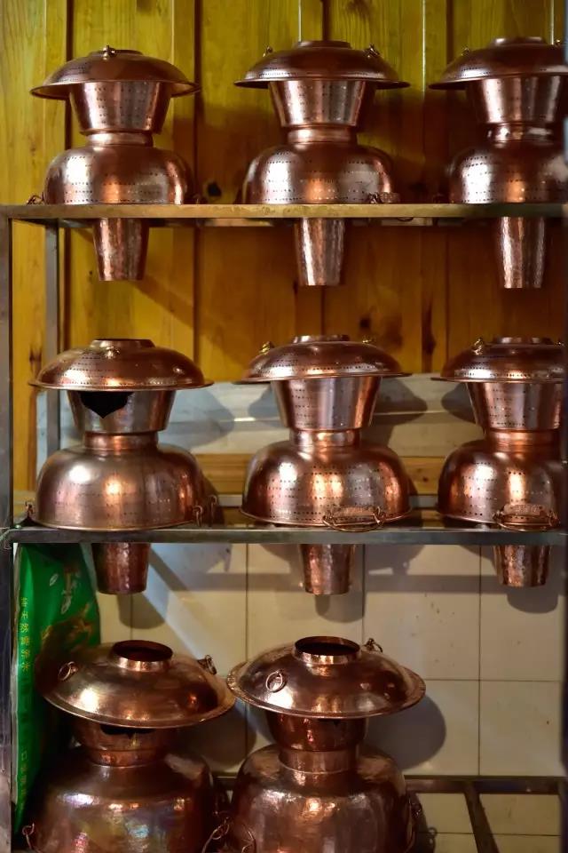 走進食府正房,左右兩邊各擺有餐桌,中央設有一茶桌、一方桌,方桌上陳列著一口銅鍋。煮通海炊鍋菜用的就是這樣的銅鍋。在古城中心街區,有多家店鋪售賣銅鍋,大大小小的各類銅鍋擺滿店面,最小的銅鍋夠四五人同時食用炊鍋菜,大的足夠十余人使用,有的銅鍋泛著锃亮的光,有的表面則附著一層黑色的“包漿”。
