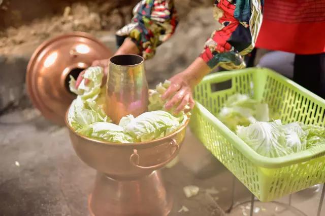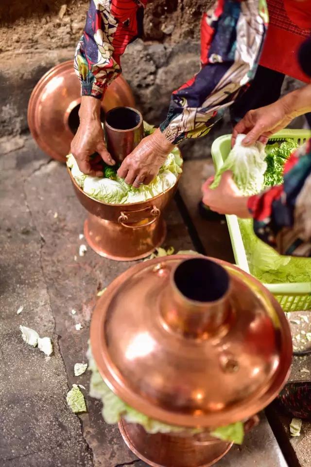 待高湯沸騰,放入新鮮玉米、甜藕、茨菇、小南瓜、芋頭,往上鋪幾層厚厚的山地白菜葉和茴香。準備妥帖,蓋上鍋蓋,烀上十多分鐘。別小看這幾樣普通食材,它們是店家的經驗之選。“我們也嘗試過放入其他時令蔬菜,如紅薯、洋芋等等,煮出來的味道始終不理想。有些食材不耐煮,融化到高湯里會影響高湯本身的味道。”馬姐說:“保留下的菜品,是我們經過多次試驗總結出來的,味道最為上乘。”