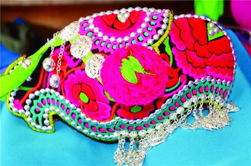武定彝族女子頭戴雞冠形的“雞冠帽”,帽檐左右兩側各裝飾一朵馬櫻花,帽檐上繡滿了盛開的牡丹,帽沿周邊用許多銀泡鑲嵌,帽辮用黑毛線制成,配以銀器自頭頂懸垂至腰間,如同臉頰兩邊長發(fā)傾瀉而下。